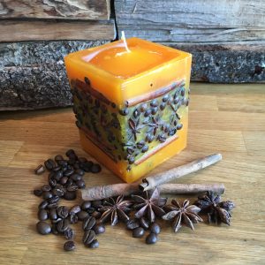 Viereckige Kerze mit Kaffeebohnen.