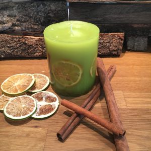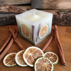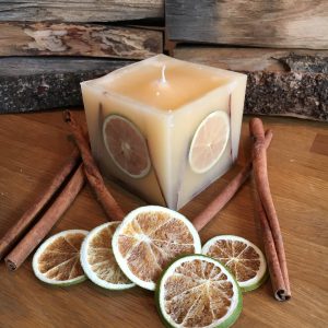 Rechteckige Kerze mit getrockneten Zitronenscheiben und Zimtstangen.
